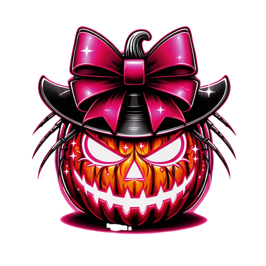 Una calabaza de Halloween caprichosa con un lazo y un sombrero de color rosa vibrante, con ojos siniestros y detalles de araña para un susto divertido.