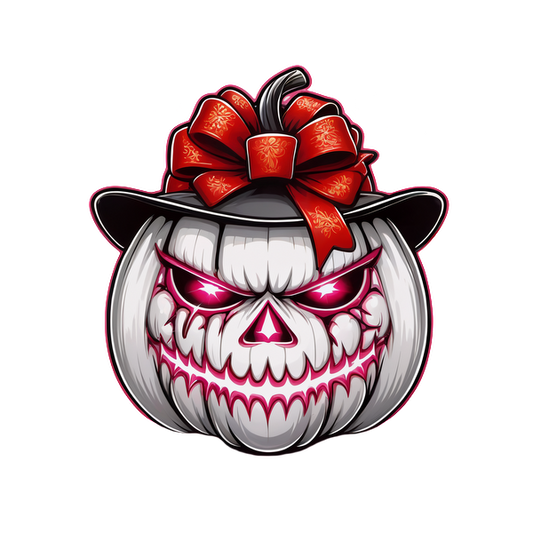Una calabaza espeluznante con una sonrisa siniestra, adornada con un elegante sombrero negro y un lazo rojo vibrante.