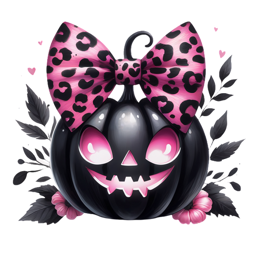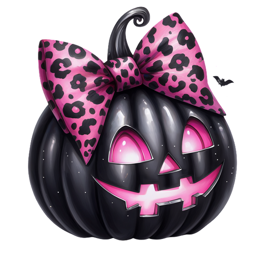 Una divertida calabaza negra con un lazo con estampado de leopardo rosa y ojos brillantes, perfecta para una elegante decoración de Halloween.