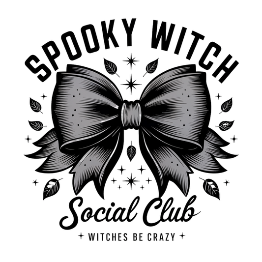 Un elegante gráfico de lazo negro que presenta el texto "Spooky Witch Social Club" con elementos decorativos, perfecto para el ambiente de Halloween.
