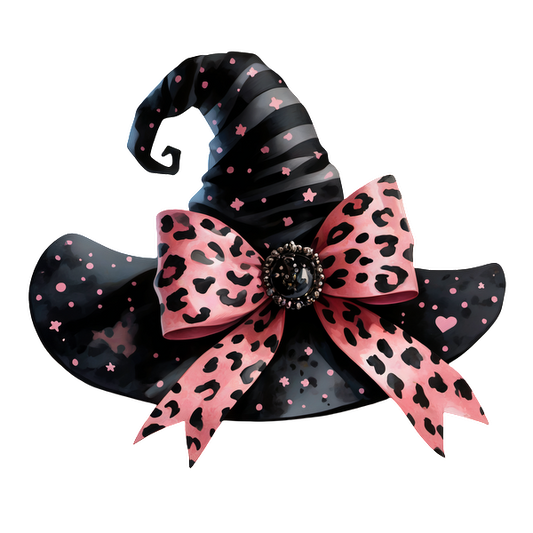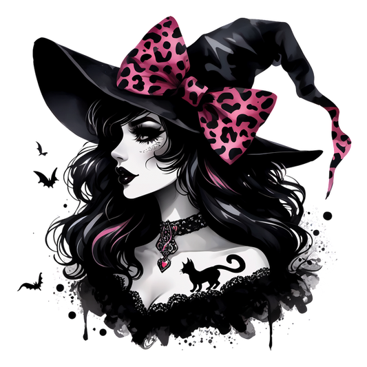 Un elegante personaje de bruja con cabello largo y negro, un sombrero puntiagudo negro y un lazo con estampado de leopardo rosa, que presenta una silueta de gato negro.
