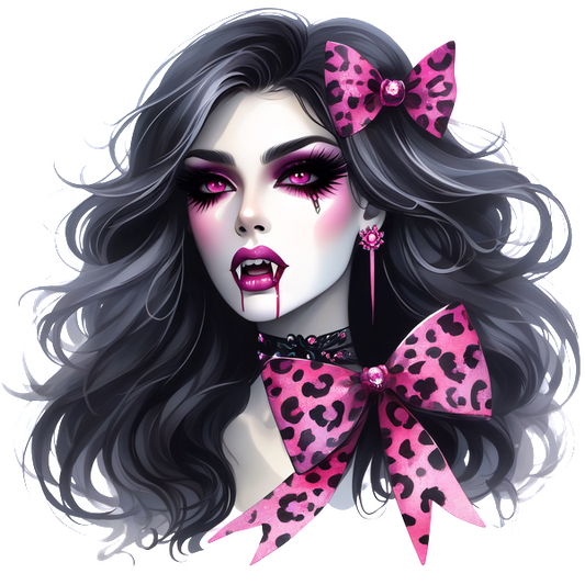 Esta llamativa ilustración presenta a una mujer vampírica con cabello largo y oscuro, maquillaje dramático y un lazo con estampado de leopardo rosa.