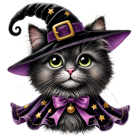 Un encantador gato negro con un sombrero y una capa de bruja violeta, adornado con estrellas y una campana dorada, ¡perfecto para Halloween!