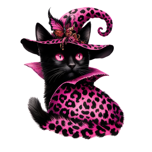 Un caprichoso gato negro con un elegante sombrero de bruja con estampado de leopardo rosa, adornado con una mariposa, que rezuma encanto y magia.