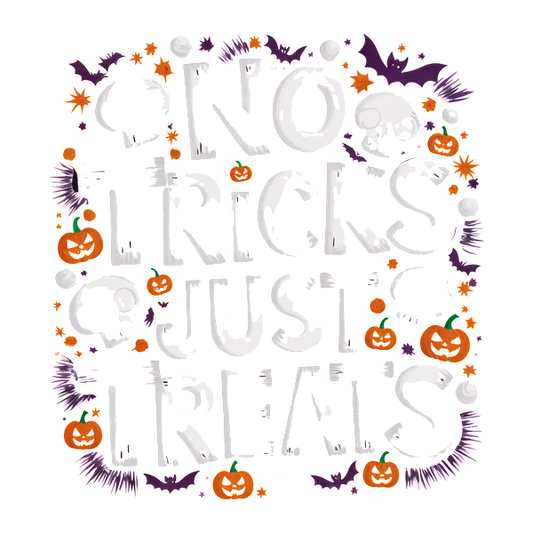 ¡Celebre Halloween con este vibrante diseño "No Tricks Just Treats", adornado con divertidas calaveras y calabazas!