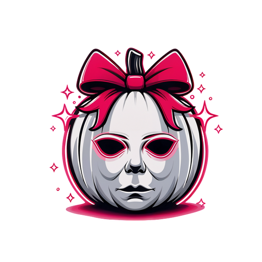 Una llamativa ilustración de una calabaza con rostro humano y un lazo rosa brillante, que irradia una atmósfera caprichosa de Halloween.