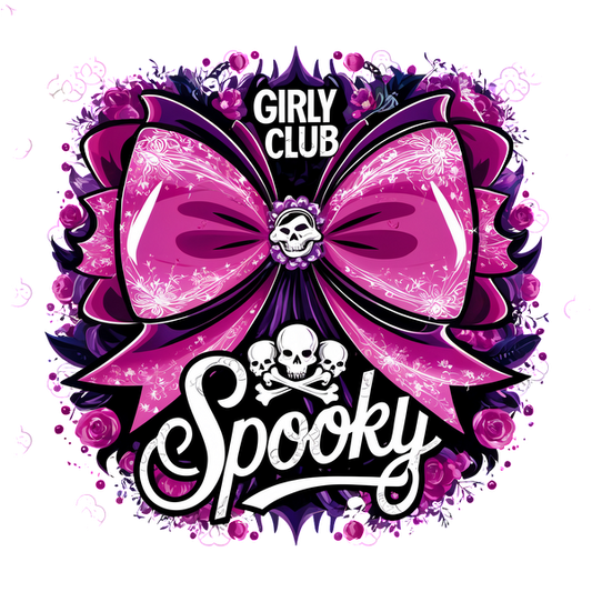 Un gráfico vibrante y espeluznante que presenta un gran lazo rosa, detalles de calaveras y elementos florales con el texto "Girly Club Spooky".