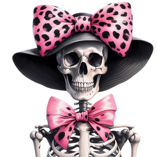 Un esqueleto juguetón que lleva un sombrero negro adornado con lazos de lunares rosados y negros, que combina humor y extravagancia.