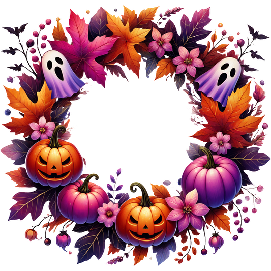 Una vibrante corona de Halloween con calabazas, motivos de fantasmas, hojas otoñales coloridas y flores divertidas para darle un toque festivo.