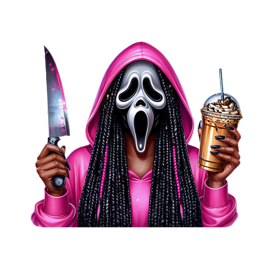 Un personaje con una sudadera con capucha rosa sostiene un cuchillo en una mano y un batido en la otra, usando una máscara fantasmal.