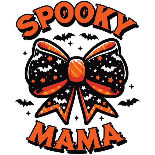Un gráfico vibrante con temática de Halloween que presenta un lazo negro adornado con estrellas y murciélagos, resaltado por el texto "Spooky Mama".