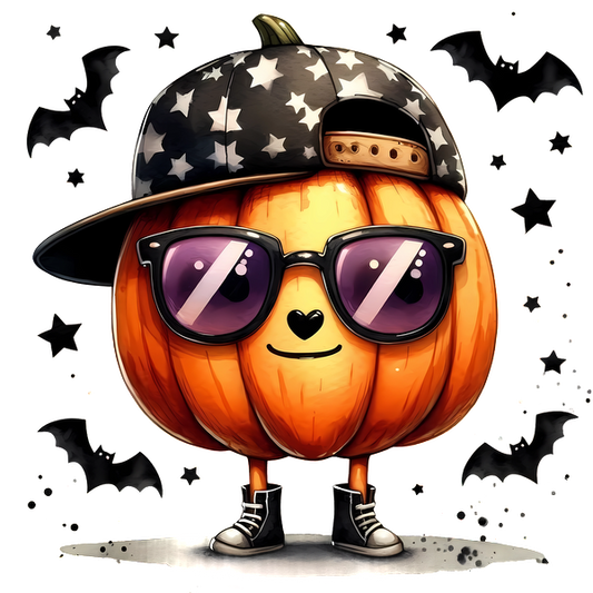 ¡Conoce a la elegante calabaza, que luce una gorra y gafas de sol con estampado de estrellas negras, rodeada de murciélagos divertidos para un ambiente festivo!