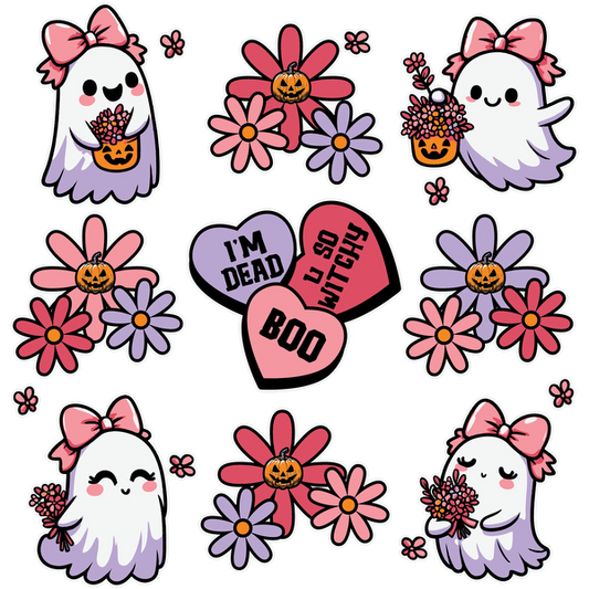 ¡Un lindo juego de pegatinas con temática de Halloween que presenta personajes fantasmas con moños, flores, calabazas y frases divertidas para una diversión espeluznante!