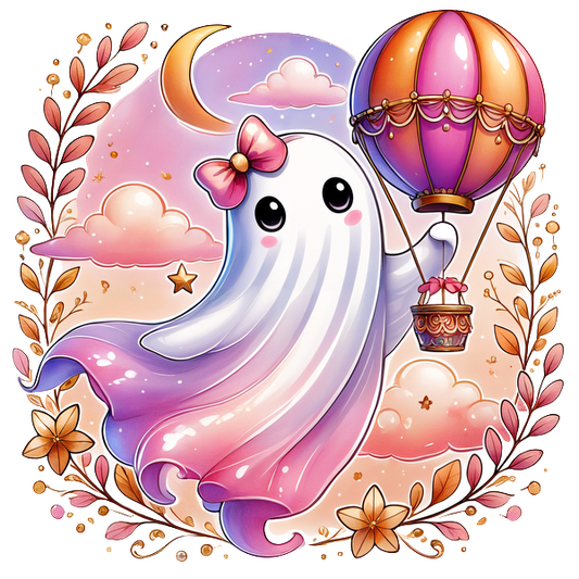 Un personaje fantasma caprichoso con un arco, sosteniendo alegremente un globo aerostático en medio de un cielo pastel de ensueño y flores.