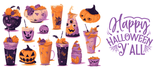 ¡Una colección festiva de bebidas y postres con temática de Halloween, con colores divertidos y diseños espeluznantes, perfectos para la temporada! Transferencias UV