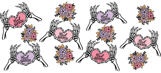 A charming collection of floral "Bad Witch" heart designs featuring soft pastel colors and elegant blooms, perfect for witches!UV Transfers dtf transfers
