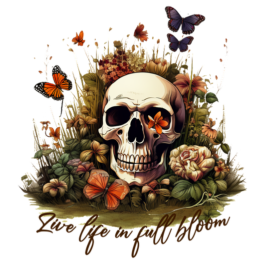 Un diseño bellamente ilustrado que presenta una calavera rodeada de flores y mariposas vibrantes, acompañada de la frase "Vive la vida en plena floración".