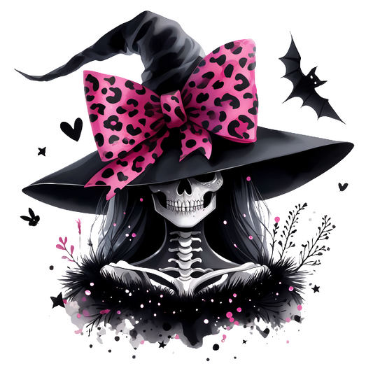 Un elegante personaje esqueleto que lleva un gran lazo con estampado de leopardo rosa y un sombrero de bruja, adornado con detalles florales y murciélagos.