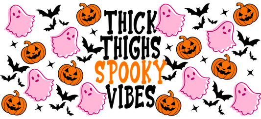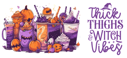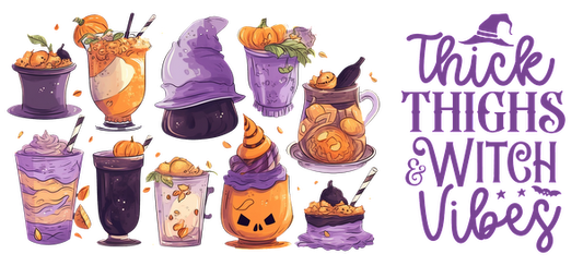 Una divertida ilustración con temática de Halloween que presenta varias bebidas y postres coloridos, complementados con la frase "Thick Thighs & Witch Vibes". Transferencias UV
