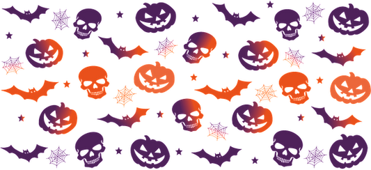 Un patrón vibrante con temática de Halloween que presenta calabazas naranjas, calaveras moradas, murciélagos y telarañas espeluznantes sobre un fondo negro. Transferencias UV