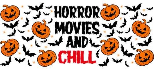 Un gráfico divertido con temática de Halloween que presenta divertidas calabazas y la palabra "CHILL" en letras rojas en negrita. Transferencias UV