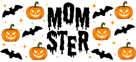 A spooky Halloween-themed graphic featuring an ominous orange pumpkin face with sharp teeth and glaring eyes against a black background.UV Transfers heat press transfers dtf prints