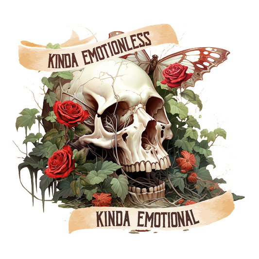 Una calavera ilustrada de forma creativa rodeada de rosas vibrantes y follaje, con la frase "Kinda Emotional, Kinda Emotional" (Un poco sin emociones, un poco emocional).
