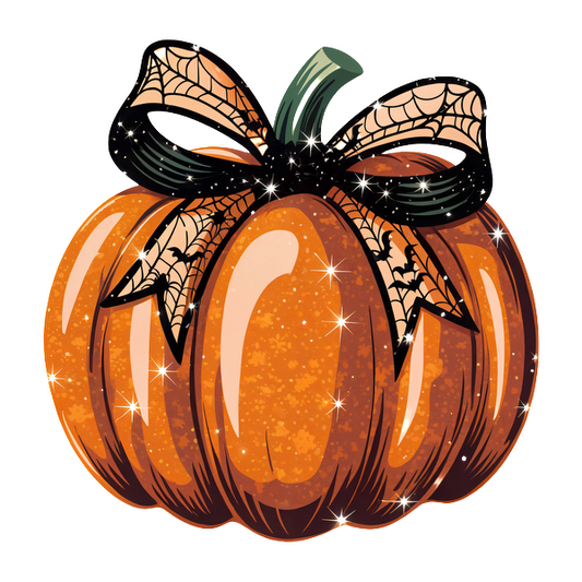 ¡Una calabaza naranja brillante adornada con un lazo de telaraña negra, perfecta para agregar un toque festivo a la decoración de Halloween!