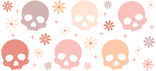 Un patrón divertido que presenta calaveras coloridas entrelazadas con flores suaves, perfecto para agregar un toque caprichoso a cualquier diseño. Transferencias UV