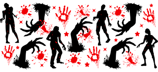 A chaotic collection of vibrant red splatters and handprints, perfect for a dramatic or spooky themed design.UV Transfers heat press transfers