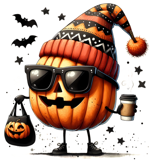 Un divertido personaje de dibujos animados de calabaza que usa gafas de sol y un gorro de punto estampado, sosteniendo un café y una bolsa de mano de Halloween.