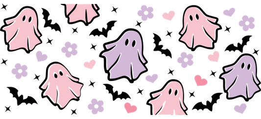 A whimsical pattern featuring cute pastel ghosts, hearts, and flowers on a dark background, perfect for Halloween decor.UV Transfersdtf regular iron