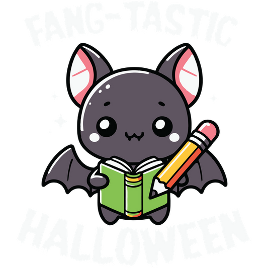 Un simpático murciélago de dibujos animados que sostiene un libro y un lápiz, celebrando un "Halloween colmillo-tástico" con destellos divertidos.