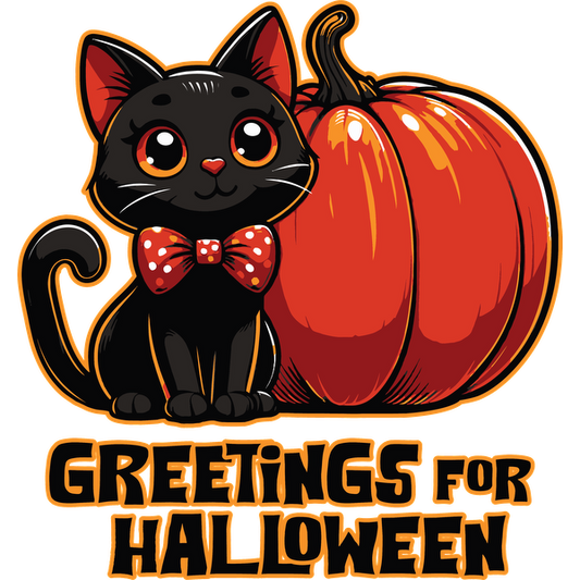 Un lindo gato negro con una pajarita se sienta junto a una calabaza vibrante, con un divertido mensaje de "Saludos para Halloween".