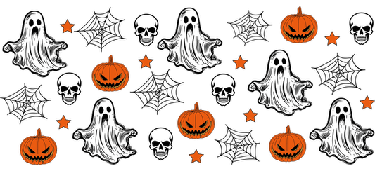 Un patrón caprichoso de Halloween con fantasmas divertidos, calabazas talladas y estrellas, perfecto para decoraciones festivas. Transferencias UV