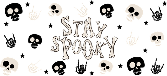 Un diseño divertido y espeluznante que presenta la frase "STAY SPOOKY" rodeada de calaveras divertidas y símbolos de manos espeluznantes. Transferencias UV