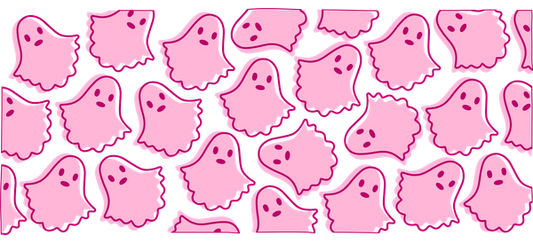 Un patrón divertido que presenta lindos fantasmas rosados, cada uno con expresiones distintivas y formas variadas, perfectos para un diseño divertido. Transferencias UV
