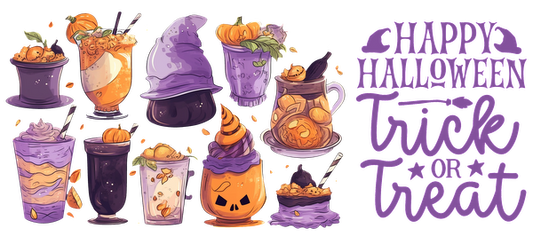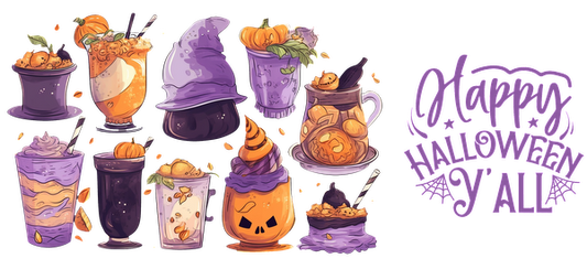 Una colección festiva de bebidas y golosinas coloridas con temática de Halloween, completa con diseños divertidos y un alegre mensaje "Feliz Halloween a todos". Transferencias UV