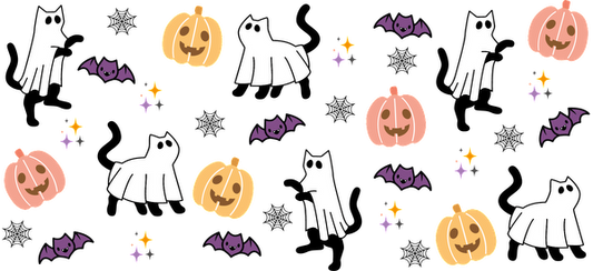 Un divertido patrón con temática de Halloween que presenta lindos fantasmas blancos, calabazas sonrientes en naranja y rosa y murciélagos juguetones. Transferencias UV
