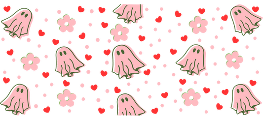 Un patrón caprichoso que presenta lindos fantasmas rosados, flores y corazones sobre un fondo negro, perfecto para diseños divertidos. Transferencias UV