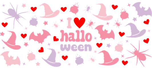 A playful Halloween-themed design featuring colorful witches' hats, hearts, bats, and spiders, proclaiming "I love Halloween."UV Transfersdtf regular iron