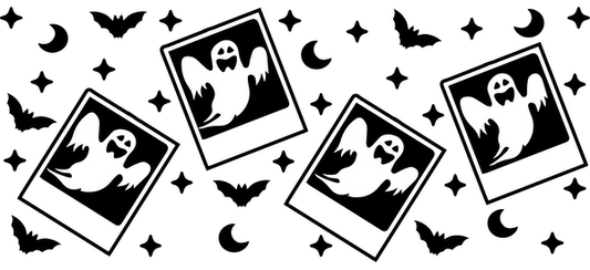 A playful design featuring white cartoon ghosts in various poses against a black background, perfect for Halloween themes.UV Transfersdtf regular iron