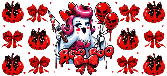 A playful Halloween-themed illustration featuring a ghostly character with pink hair, holding balloons and surrounded by red bows and pumpkins.UV Transfers heat press transfers