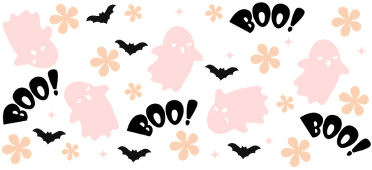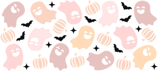 Un diseño caprichoso que presenta lindos fantasmas rosados, murciélagos negros y flores suaves, creando una atmósfera divertida y espeluznante. Transferencias UV