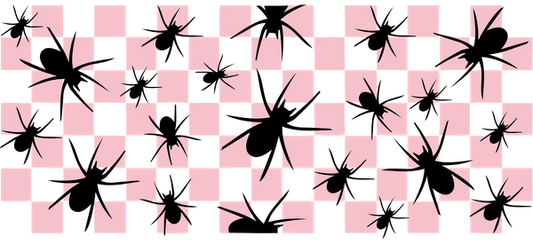 A stylish pink and black pattern featuring abstract spider-like shapes against a checkerboard background, creating a bold visual impact.UV Transfersdtf regular iron