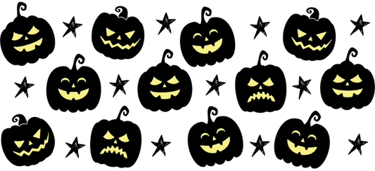 A fun array of cartoon-style orange pumpkins with mischievous, playful faces, perfect for Halloween-themed decorations!UV Transfers heat press transfers