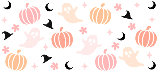 Un patrón caprichoso con temática de Halloween que presenta lindos fantasmas, calabazas, sombreros de brujas, arcoíris y elementos florales en colores suaves. Transferencias UV