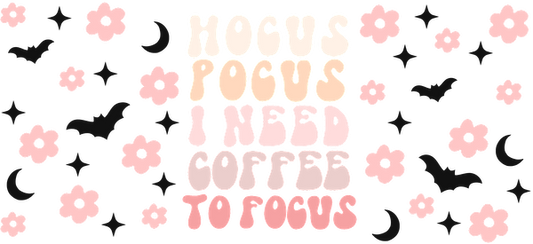 Un diseño extravagante que presenta la frase "Hocus Pocus, I Need Coffee to Focus" (Necesito café para concentrarme), rodeada de flores rosas y murciélagos. Transferencias UV