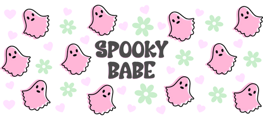 Un diseño divertido y colorido que presenta lindos fantasmas, corazones y flores rosas, con el texto "Spooky Babe" en el centro. Transferencias UV