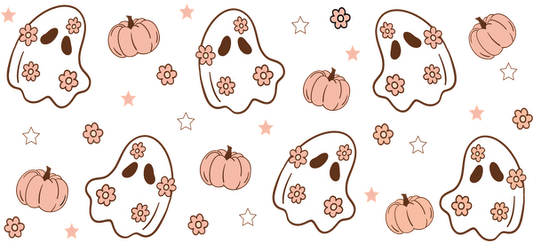 Un patrón divertido que presenta lindas ilustraciones de fantasmas adornadas con flores y acompañadas de calabazas y estrellas brillantes, perfecto para Halloween. Transferencias UV